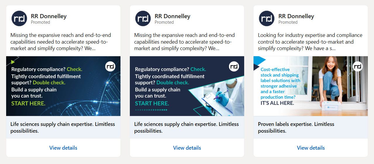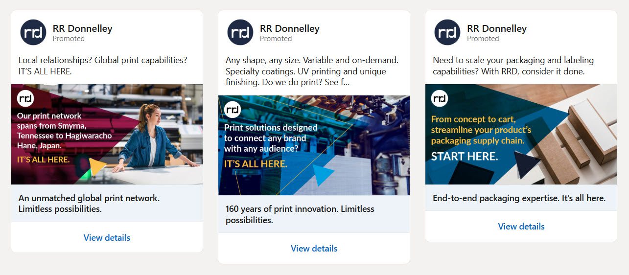 The first print company on our list is RR Donnelley. Undeniably known across the print industry, this company is actually running a lot of LinkedIn ads. Let’s take a look at them here.